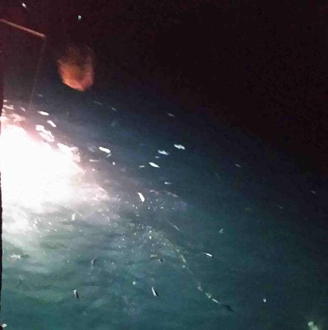 海は穏やで雨が強くなってきたが、トビウオはタモ網でポツポツ掬える程度入ってきた。